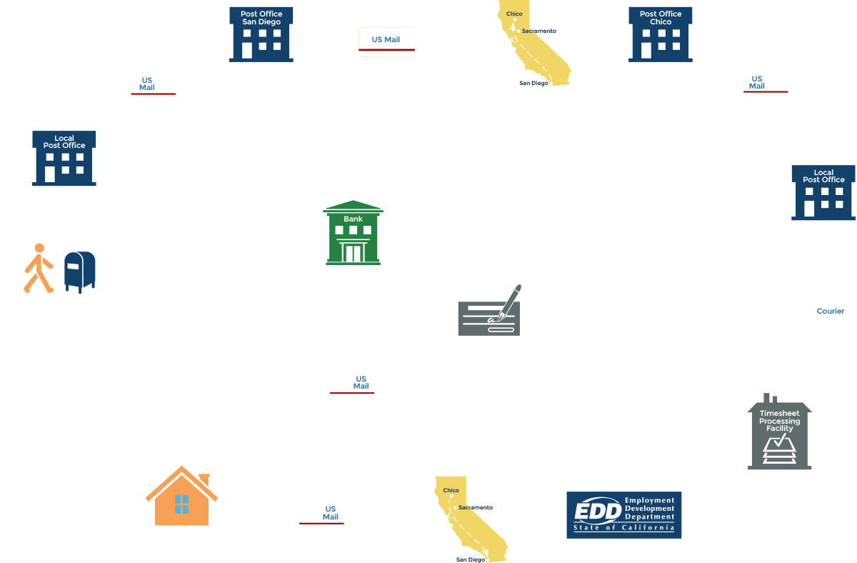 El Estado de California tiene 10 días hábiles para emitir un pago a partir de la fecha en que se recibe la hoja de tiempo en la Instalación de Procesamiento de Hojas de Tiempo en Chico, California.